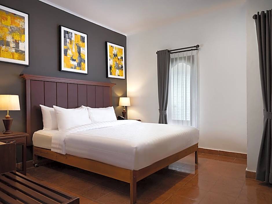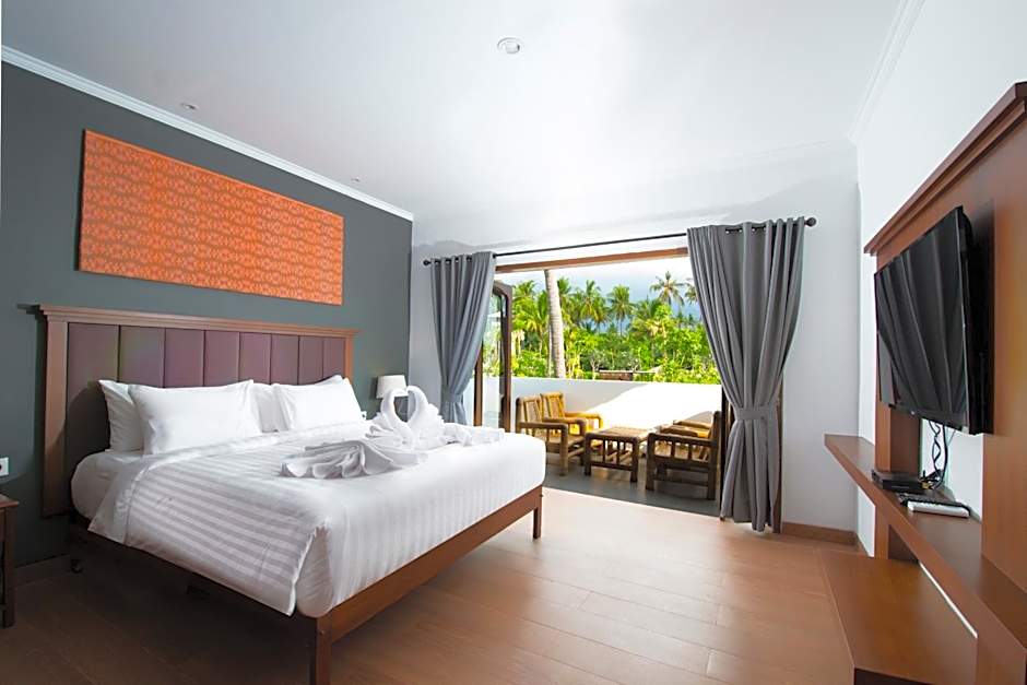 A cozy room with an private bathroom and a private balcony surrounded by a garden.